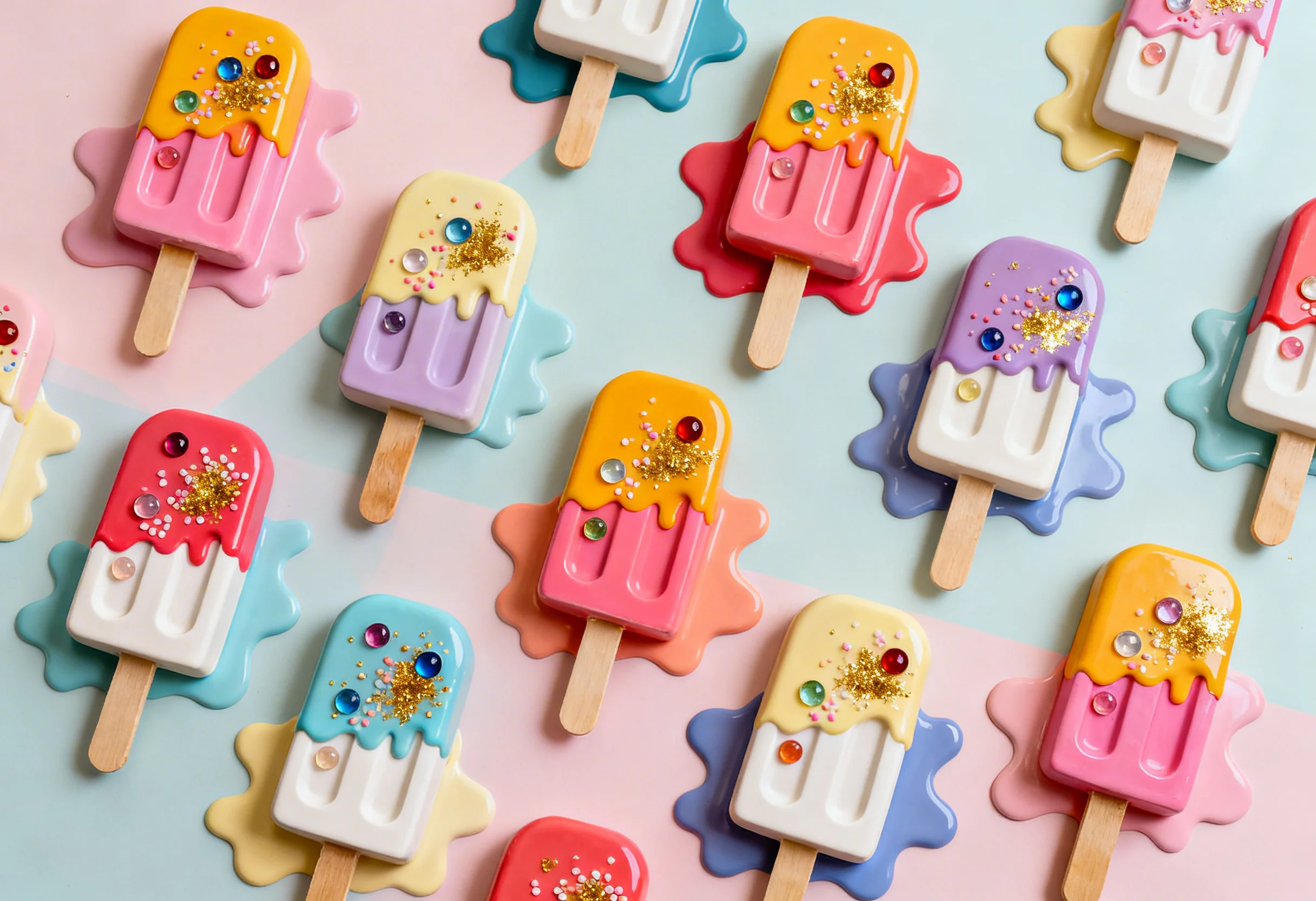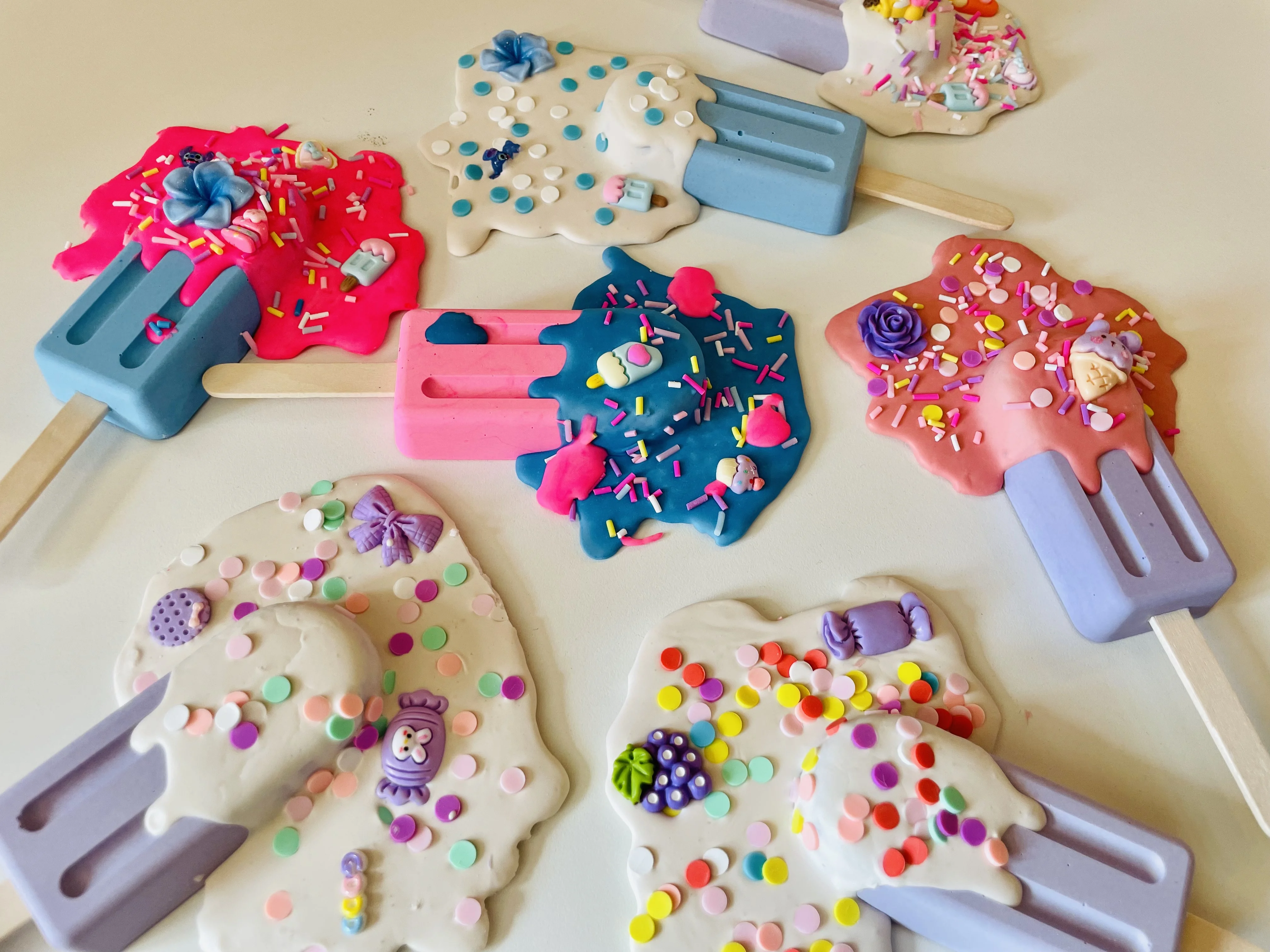 Als we de ijsjes uit de mold halen gaan we de drips maken. Deze versieren we met sprinkels en charms en dat moet even drogen. Je gaat naar huis met super leuke ijsjes in een mooi doosje.